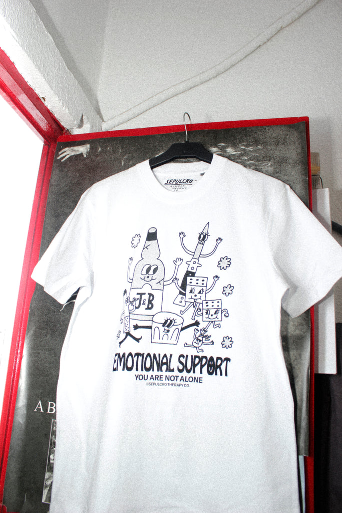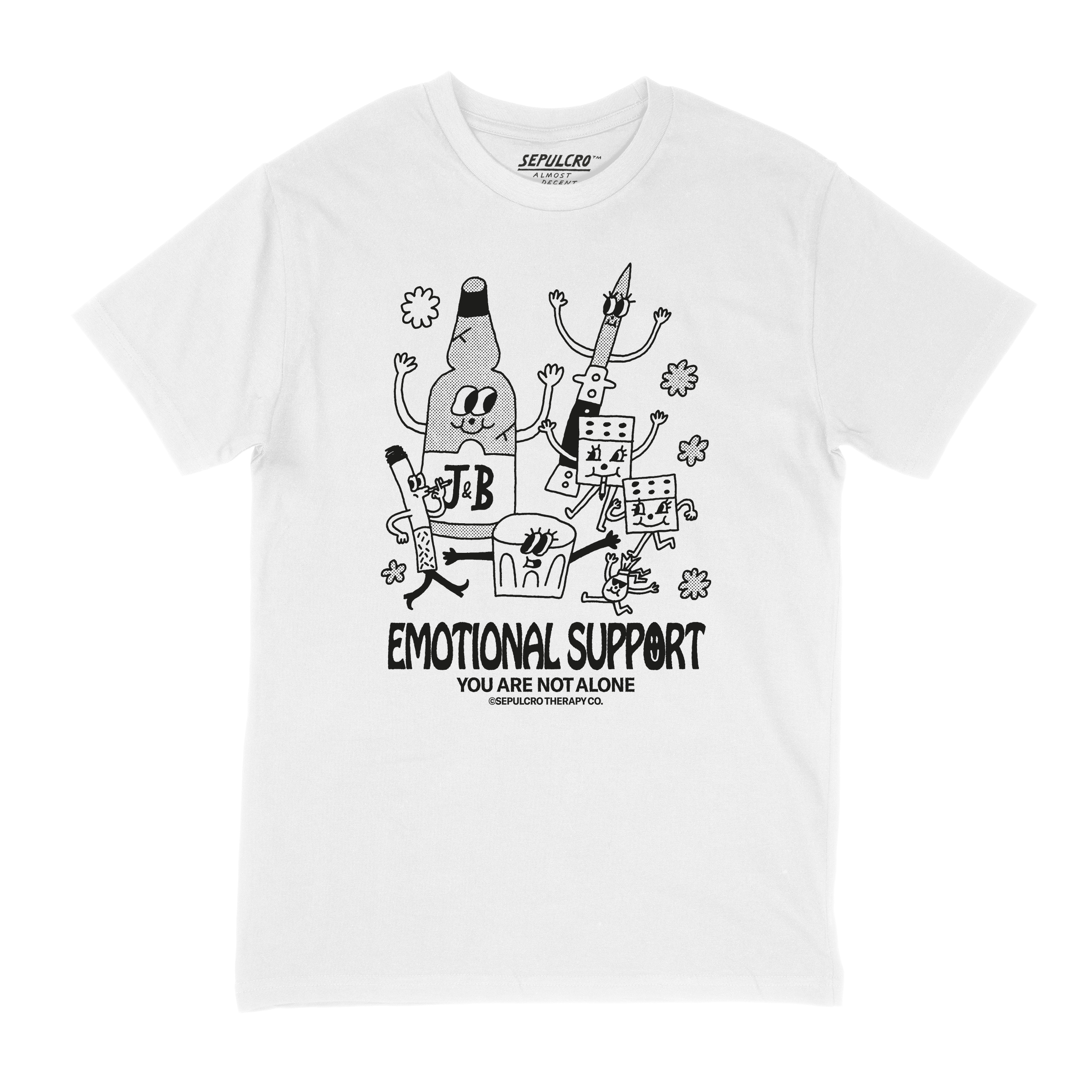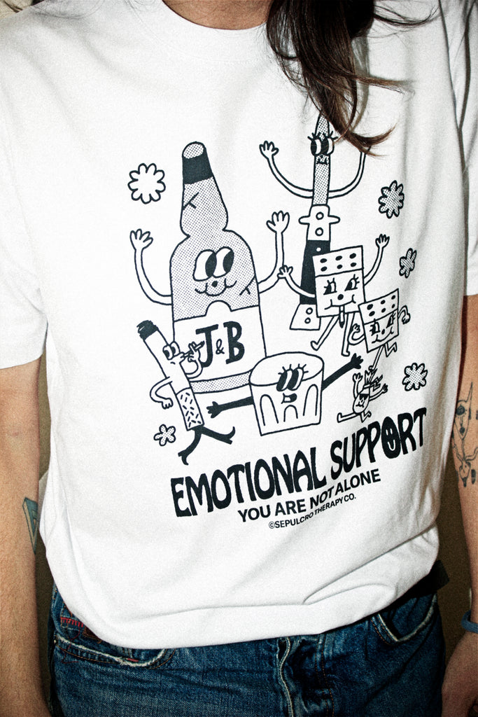 Our Emotional Support T-Shirt is a heavyweight (220gsm) classic unisex fit made from 100% cotton, hand screenprinted with eco-friendly water-based ink. It's sustainably made, vegan, and crafted with fair and safe working conditions in mind.