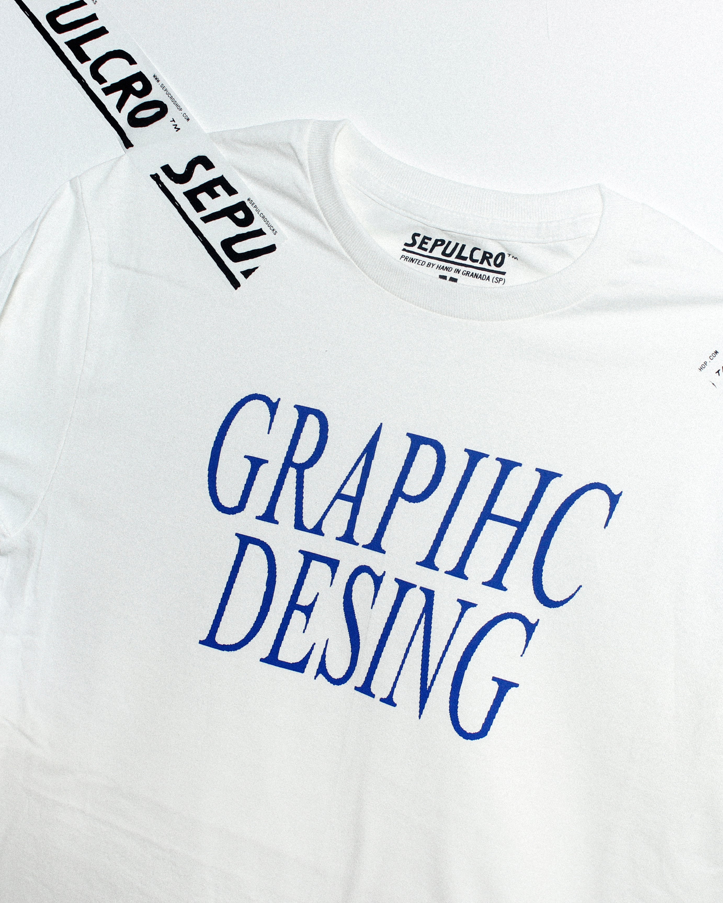 Screenprinted by hand with eco-friendly and soft to the touch water-based royal blue ink on a white 100% cotton classic unisex fit t-shirt (200gr).